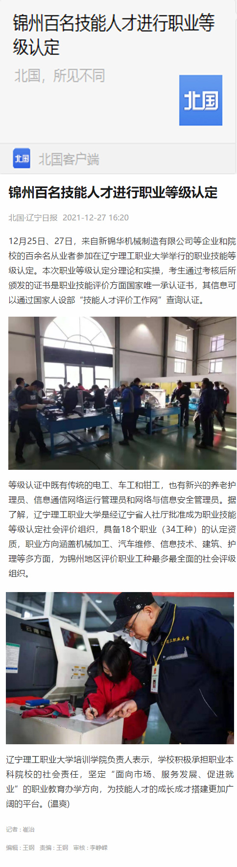 2021年末,我校开展了首批全国职业技能等级认定工作,历时两天,百余人参加。此项工作不仅在社会上颇有反响,还引起多家媒体的热切关注,《学习强国》辽宁学习平台以“辽宁理工职业大学:首批职业技能等级认定工作顺利完成”为题进行了报道;《辽宁日报北国客户端》以"锦州百名技能人才进行职业等级认定"为题,对我校首批全国职业技能等级认定工作进行了深度报道;同时《辽宁日报北国网》教育专栏也以"辽宁理工职业大学首批职业技能等级认定工作顺利完成"为题进行了报道;《锦州日报》以"国家职业技能等级认定在锦顺利开展"为题进行了详细报道。