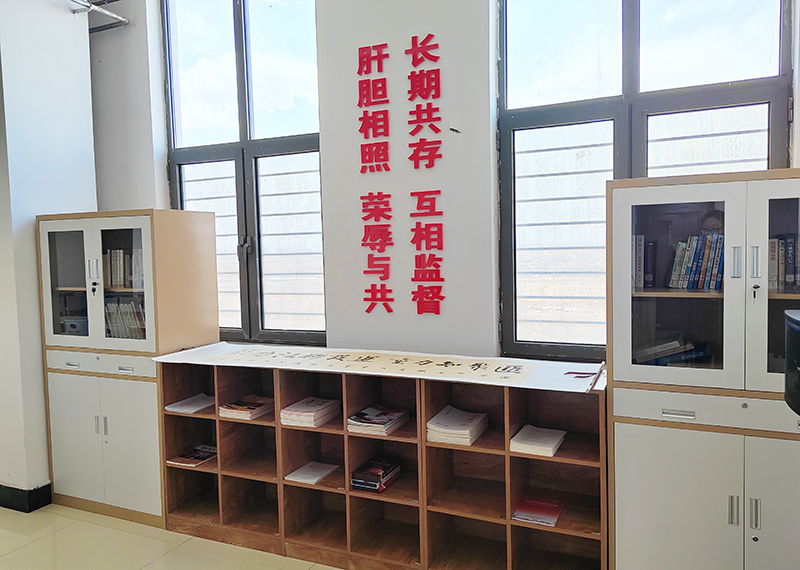 统战工作室位于我校北校区主楼1208室,室内墙壁悬挂9幅图片,生动形象的记录了近几年来我校统战工作发展情况。习近平总书记在党的二十大报告中提出的“人心是最大的政治,统一战线是凝聚人心、汇聚力量的强大法宝”的论述跃然墙上。还有构思精致,内容充实,颇有创意的图书摆放在室内两个书柜,供大家共同学习、探讨、交流。