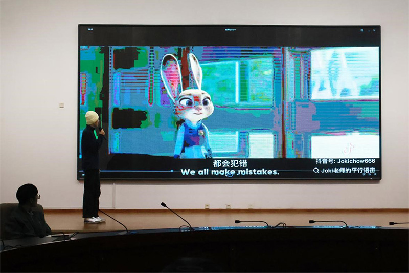 活动现场,同学们通过双语配音、经典诵读等形式展开精彩演绎。路雨萌、董妍等同学分别演绎《觉醒年代》中的片段,展现思想觉醒历程;张京铭、高景祺同学分别配音《疯狂动物城》《功夫熊猫》等英文片段,语音纯正,情感饱满,赢得阵阵掌声。