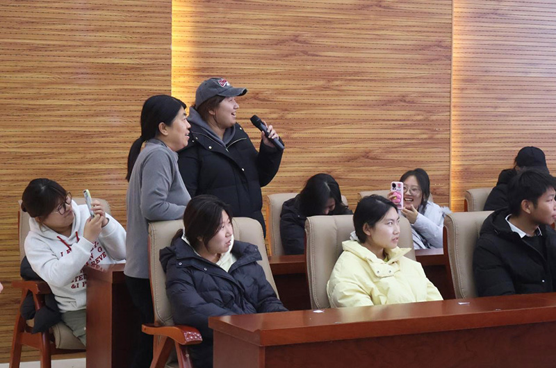 在互动环节中,设置了英语朗读、抽取号码等趣味形式,现场气氛活跃,互动性强。姜欢老师现场指导,带领同学们学习单词发音、语调技巧,并结合实际讲解英语等级考试的学习方法,帮助大家在轻松的氛围中提升语言应用能力。