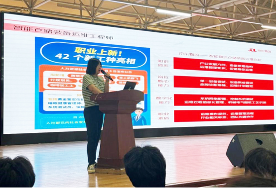 接着,京东物流教育部门经理许妍妩向同学们展示了京东物流雄厚的企业实力与先进的物流技术,从其庞大的物流网络布局,到自动化仓储、智能配送等前沿科技的应用,让大家对京东物流行业领军地位有了直观了解。许经理重点介绍校企共建的现场工程师班采用“校企双元主体”育人机制,校内由企业教师负责讲授专业核心课,全程参与实践指导,实现理论与实践紧密融合。第一届在2024级学生中择优选拔30人组班,通过两个学年进行专门培养,技能认证合格、岗位实习优秀的学生,通过双选安置在京东物流集团智慧仓智能设备运维和运营管理岗位上实行高标准就业。