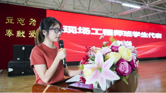 14时整,在全场倒计时声中,谭英杰副校长、范广辉副总裁共同为现场工程师班揭牌。红绸缓缓落下,鎏金牌匾熠熠生辉,现场掌声经久不息。随后,2024级现场工程师班学生李焱作为学生代表上台发言。她难掩激动与憧憬:“能成为现场工程师班的一员,我们既感荣幸,更知责任重大。未来,我们会珍惜校企合作的优质资源,‘啃透理论知识、练强实践本领’,以‘现场工程师’的标准严格要求自己,力争早日成长为能为行业、社会作贡献的人才!”