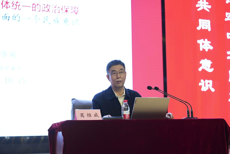 报告中,葛维威以《从“大一统”到“铸牢”——维护中华民族一体统一的政治保障》为题,为在场师生带来一场有政治高度、理论深度和历史厚度的思想盛宴。他紧扣《中华民族共同体概论》教材,从历史、理论、现实三大逻辑出发,生动讲述了中华民族从“五方之民”共聚到“大一统”格局形成,再到现代国家建构的恢弘历程,深刻阐释了“铸牢”意识的极端重要性和时代必然性。