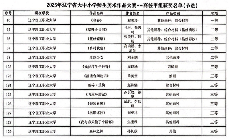 近日,我校在2025年辽宁省大中小学师生美术作品大赛中获得多个奖项。其中荣获省级一等奖1项、二等奖4项、三等奖8项。