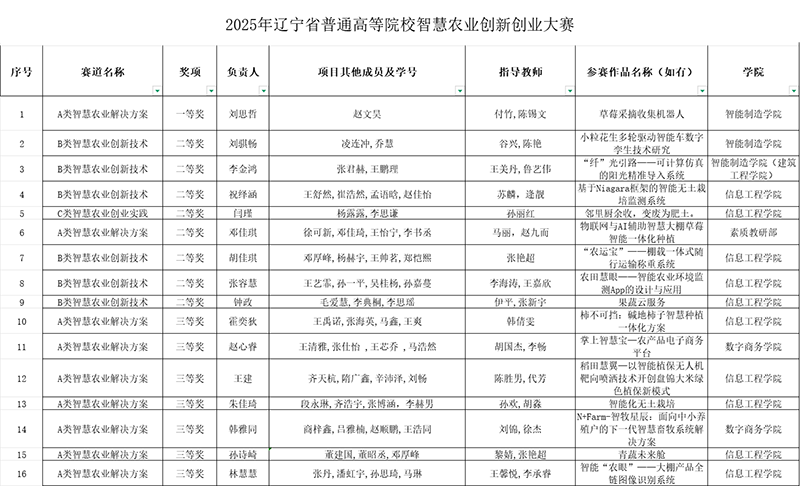 近日,2025年辽宁省普通高等院校智慧农业创新创业大赛获奖名单正式揭晓。本届大赛以“数智赋能农业,创新驱动振兴”为主题,吸引了全省50余所高校的300余支团队同台竞技。