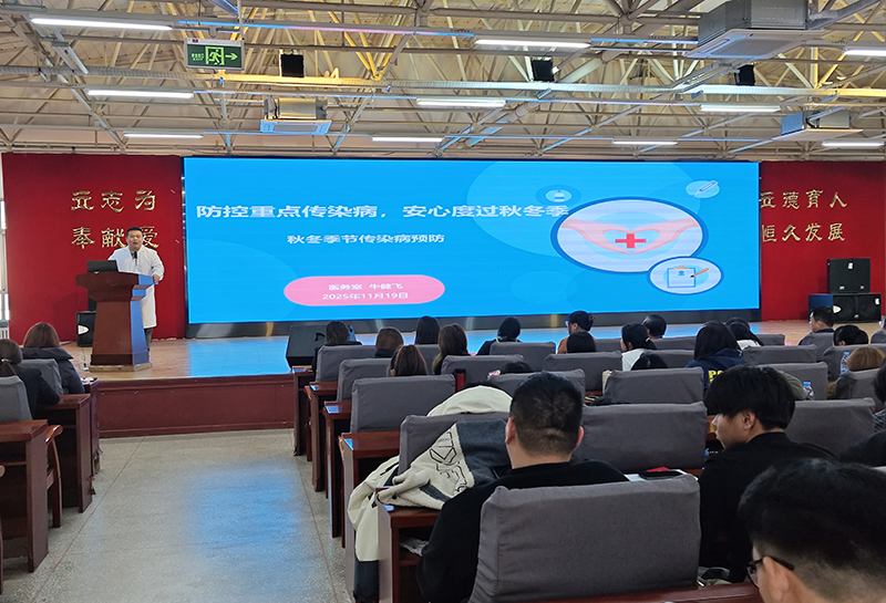 为深入贯彻落实《辽宁省疾病预防控制局 辽宁省教育厅 辽宁省卫生健康委员会关于做好秋冬季校园重点传染病防控工作的通知》及《锦州市卫生健康委员会 锦州市教育局关于做好秋冬季校园重点传染病防控工作的通知》相关要求,切实履行学校传染病防控主体责任,2025年11月19日下午,由总务处医务室主办的“防控重点传染病,安心度过秋冬季”主题宣传活动在南校区图书馆四楼报告厅顺利举行。总务处杨玲处长、健康文旅学院李娟院长、数字商务学院吴景泰院长、总务处孙萍副处长、总务处资产科国歌副科长与百余名学生共同参与,会议由许思文老师主持。