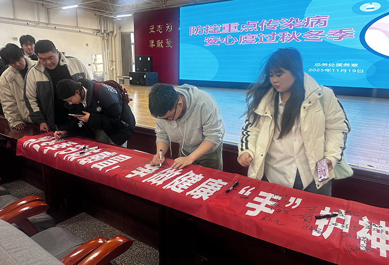 活动尾声,与会师生纷纷在“秋冬季节防感冒,争做健康‘手’护神”的条幅上郑重签名,承诺践行勤洗手、防疾病的健康行为,并领取了《秋冬季节,科学预防,向感冒说“不”!》宣传手册。最后,全体人员在签名条幅前合影留念,为本次活动画上圆满句号。