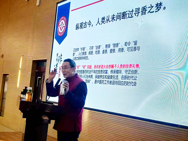 香道传承——五千年匠心薪火相传:活动伊始,袁明老师从朝阳牛河梁女神庙遗址出土的五千年前陶熏炉盖说起,将药香文化的悠久历史娓娓道来。他向师生们介绍,凌河药香以锦州本地艾草、白芷、松果等中草药为原材料,采用传统冷磨工艺制作。他强调只有用中草药材冷磨工艺做出来的香品才是真正的正品。