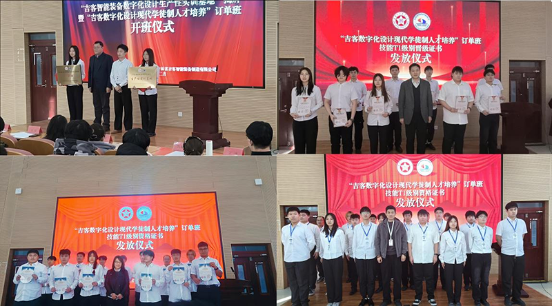 吉客智能装备与辽宁理工职业大学的合作,是企业破解人才需求难题、深化产教融合的关键举措。自2025年9月以来,企业已投入价值 40 余万元的软硬件设备,组建 5 人驻校教学管理团队,搭建起集真实生产场景、实训教学、科研服务于一体的生产性实训基地。目前,学员已熟练掌握 CAD、CATIA 等核心设计软件,融入多品牌汽车设计标准,目前10 人通过技能 T1 等级认证,13人取得技能 T1 资格,初步彰显了现代学徒制的育人成效。实训基地的落成与订单班的开班,是校企践行现代职业教育理念的生动实践。基地将真实生产项目引入校园,实现“工学交替、双元育人”,订单班则创新融合机械原理、电气控制与 PLC 应用等核心课程与企业真实项目,为学生搭建了技能提升与职业发展的快车道。实现了入学即入职、毕业即就业的目的。
