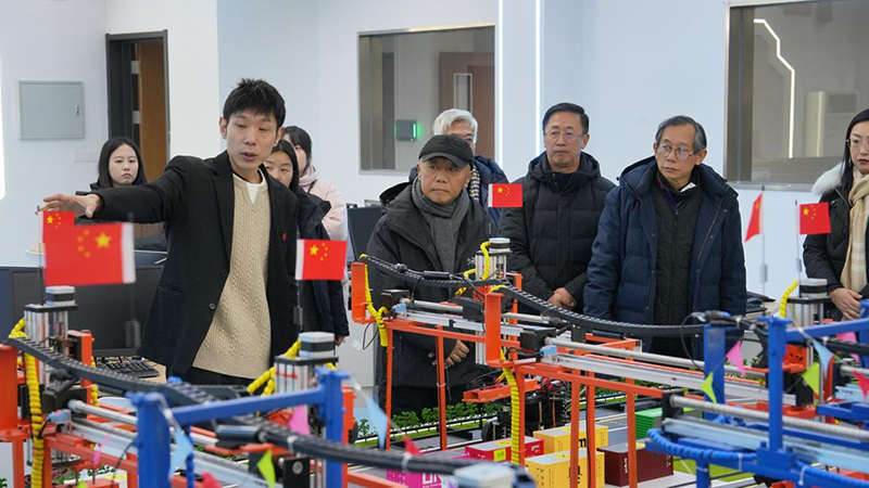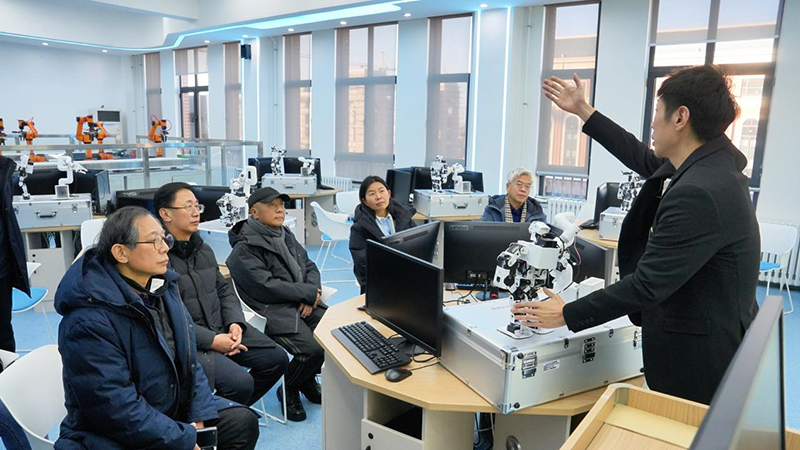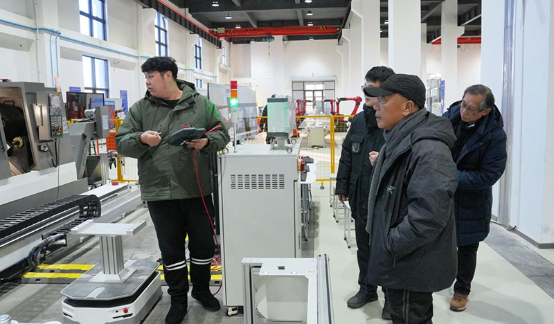 随后,协会领导一行来到智能制造学院生产性实训基地,智能制造学院副院长谷铮围绕基地的生产功能、实训功能、科研功能“三位一体”的建设理念进行汇报。现场展示了数控加工、智能装备调试、工业机器人应用等多个实训区域,介绍了基地如何通过实际生产项目教学模式,让学生在真实生产场景中提升实操技能。协会领导对基地将生产实践与人才培养深度融合的做法表示认可,认为此举有效提升了职业教育的针对性和实效性。