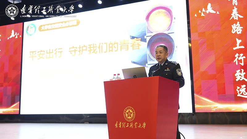为进一步强化全校师生交通安全意识,提升自我安全防护能力,筑牢校园安全防线,4月8日下午,我校特邀锦州市公安局交通管理支队一级警长冷柏警官进校园,开展交通安全教育专题讲座。学生处全体工作人员、各二级学院辅导员及900余名学生代表参加,本次讲座由学生处处长朱磊主持。