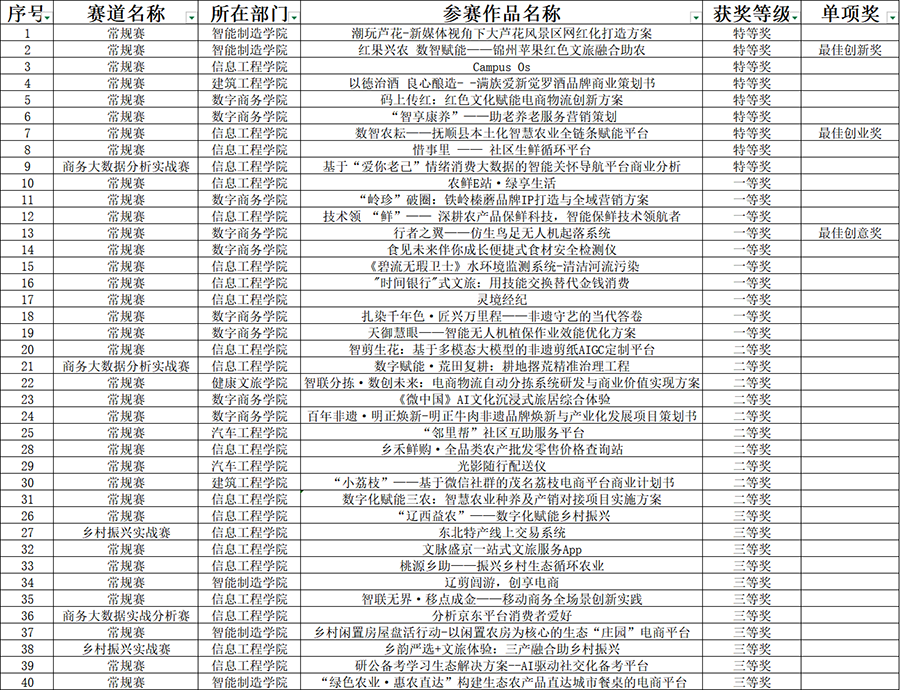 经评委现场打分、工作人员严谨统计核算,本次大赛共评选出特等奖9项、一等奖10项,二等奖10项、三等奖11项及最佳创新奖、最佳创意奖、最佳创业奖各1项。学校将依据辽宁省“三创赛”相关要求,择优推荐优秀团队晋级省级赛事,冲击更高荣誉。
