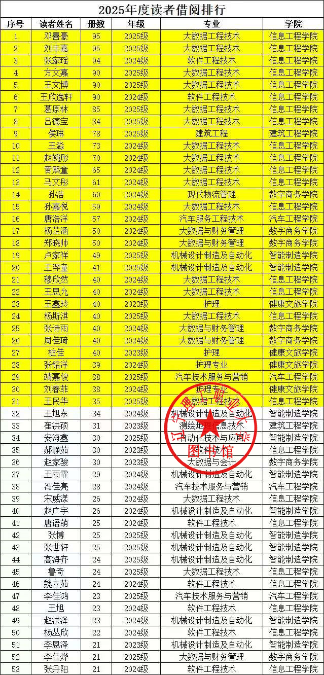 为表彰先进、树立榜样,图书馆对全体参与借阅的读者借阅册数进行精准统计与排名,最终53名读者荣获本次活动奖励。根据活动规则,阅读量排名前53名(含并列)的读者,将授予创新学分0.5分;其中前31名优秀读者(含并列)获得物质奖励,一等奖6名、二等奖10名、三等奖15名。他们以扎实的阅读积累,为全校学子树立了勤学善读的良好榜样。