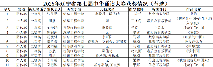 近日,由辽宁省教育厅主办的2025年辽宁省第七届中华诵读大赛圆满落下帷幕。本届大赛以“经典铸魂兴辽韵,数智扬帆启新程”为主题,紧扣辽宁“打造新时代‘六地’”的发展定位,致力于促进中华优秀传统文化与区域振兴实践的深度交融。我校学生在此次大赛中表现突出,凭借扎实的文学素养与精湛的诵读技艺,在多个奖项上均有收获,最终荣获一等奖2项、二等奖6项、三等奖3项。这一丰硕的战果,是我校语言文化建设成果的生动体现,更是一张彰显我校美育教学与实践实力的亮眼名片。