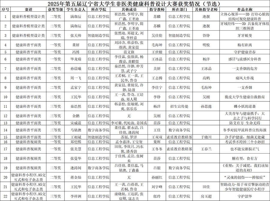 近日,由辽宁省教育厅主办、沈阳医学院承办的2025年第五届辽宁省普通高等学校大学生非医类健康科普设计大赛圆满落下帷幕。本次大赛以“将健康观念融入所有”为核心理念,旨在激发省内各高校大学生运用信息技术解决实际问题的综合实践能力,培养团队合作意识和创新创业能力,同时做好健康教育,将科学的防病治病理念和健康教育方法传播给社会,引导科学就医行为,提高学生健康素养。我校学子在此次大赛中表现优异,凭借扎实的专业素养与出色的创意设计能力,在多个赛道中脱颖而出,最终荣获一等奖5项、二等奖10项、三等奖7项。