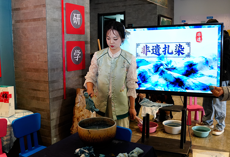 扎染工坊内,伊平老师讲解白族扎染的历史渊源与工艺原理,同学们通过折叠、捆扎、染色等方式,解锁独一无二的蓝白纹样。