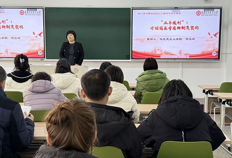何正玲教授解读了党的二十届四中全会审议通过的《中共中央关于制定国民经济和社会发展第十五个五年规划的建议》的主要内容,强调“十五五”时期是基本实现社会主义现代化的关键时期,并从历史维度、治理维度和价值维度深入分析了“五年规划”在中国式现代化进程中的关键作用,指出科学制定和接续实施“五年规划”是党治国理政的重要方式,是实现中国发展奇迹的制度密码。何教授通过历史脉络与现实案例的对比,生动阐释了“五年规划”中党的集中统一领导、科学决策机制与群众路线相结合的制度效能,为全体教师提供了一场理论深厚、视野开阔的专题宣讲。