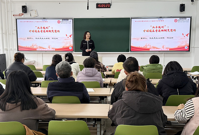 为深入学习贯彻党的二十届四中全会精神,推动全会精神在师生中落地生根,12月5日下午,健康文旅学院党总支在综合楼407教室举办专题宣讲活动,特邀马克思主义学院宣讲团何正玲教授作题为《五年规划:中国发展奇迹的制度密码》的专题讲座。本次活动由党委宣传部统一部署,旨在引导全体教师深刻领会全会精神,强化使命担当。