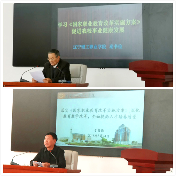 校长秦书俭根据《方案》中的二十条内容,结合我校实际,就与我校发展相关的内容总结了十六条,分别从发展方向、育人模式、社会作用等几个方面对《方案》进行了解读,对于今后我校建设优质职业院校具有重要指导意义。于自强副校长结合《方案》,针对学校今后一个时期的教学工作提出了自己看法,他就专业内涵建设、人才培养模式、人才培养质量、协同育人新机制等七个方面诠释了“如何培养人”和“怎样培养人”的问题,提出要落实《方案》精神,深化教育教学改革,全面提高人才培养质量。