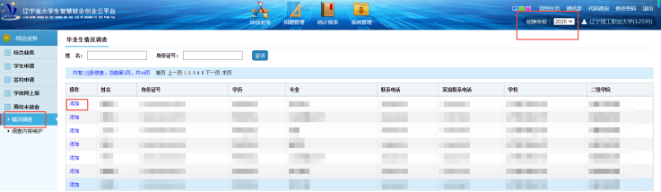 各学院登录就业系统学院端,到“离校未就业-情况调查”功能模块,根据模块中提供的调查内容进行“操作——添加”调查填报。