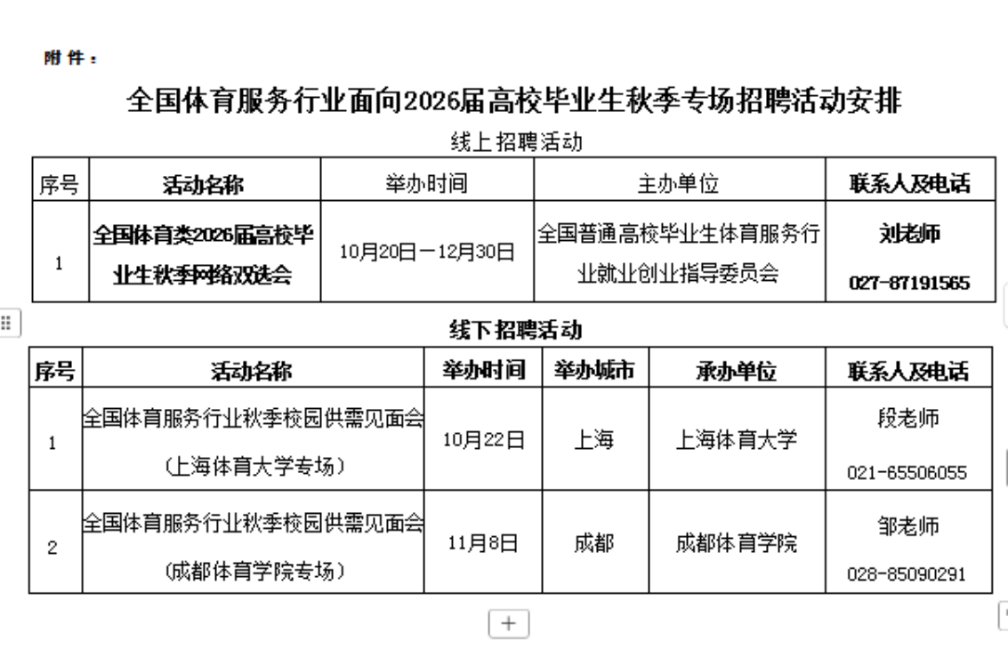 (一)举办线上专场招聘活动。即日起至12月30日,在国家大学生就业服务平台(https://www.ncss.cn)举办全国体育类2026届高校毕业生秋季网络双选会,集中发布全国体育服务行业用人单位招聘信息,促进高校毕业生与用人单位供需精准对接。