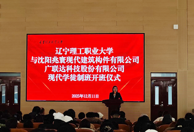 12月11日,辽宁理工职业大学建筑工程学院与沈阳兆寰现代建筑构件有限公司、广联达科技股份有限公司联合培养的现代学徒制班举行了开班仪式。这不仅标志着多元产教深度融合、协同育人迈出关键一步,更为建筑工程专业学生适配建筑行业数字化、工业化转型搭建了优质成长通道,同时为装配式建筑、智能建造等新兴岗位培育新质生产力人才。沈阳兆寰现代建筑构件有限公司董事长张玉波、总经理白兵,辽宁理工职业大学建筑工程学院院长孙阳、副院长张岩、张丽娜、徐冬梅,以及辅导员等出席了开班仪式。活动由建筑工程学院副院长徐冬梅主持。