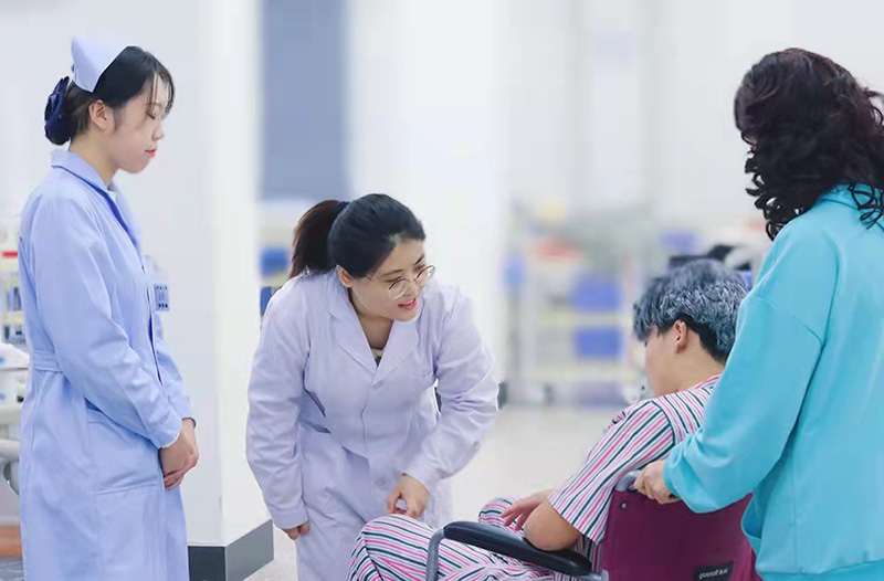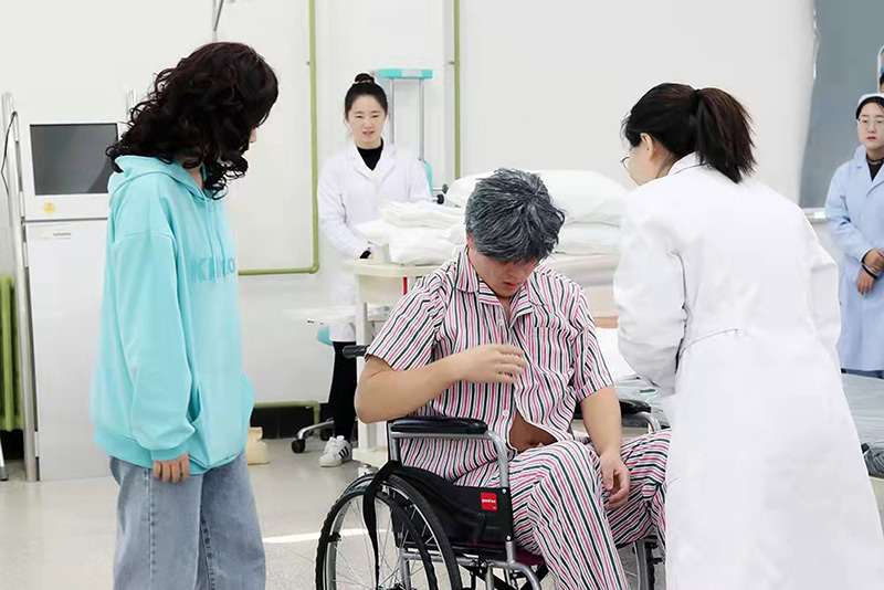 为了把临床真实案例融入到情景剧教学中,高艺萌老师利用暑假的时间到义县人民医院康复科进行了一个月的企业实践。在实训课前,高艺萌老师结合采集到的案例,编写了“战胜卒中,守护健康”的主题剧本。剧本共有7个角色,包括康复科医生、脑卒中偏瘫老人、患者家属、门诊护士,实习男护士和两名病房护士。康复科医生由高艺萌老师自己出演,其余角色由学生参演。实训课之前高艺萌老师将剧本发给主动要求参演的同学并在实训课之前进行了排练。剧本以一位脑卒中偏瘫老人为典型案例,主要包括两个场景,第一个场景是家属推着坐轮椅的偏瘫老人到康复科的护士站,门诊护士对偏瘫老人进行病史资料的问诊和专业量表的评定。第二个场景是偏瘫老人和家属至康复科病房进行康复治疗,高艺萌老师将“脑卒中患者自己学会穿衣和脱衣”“脑卒中患者被动从床转移到轮椅”和“脑卒中患者软瘫期良肢位摆放”的三个重要的规范操作融入到情景剧中,并在剧情中加入了对患者和家属的情绪安抚、人文关怀和关爱生命的健康宣教内容。学生的表演极富表现力,贴近现实,富有真情,充满了爱心、耐心和责任心,在此过程中学生很快掌握了3个重要的康复护理实操项目。