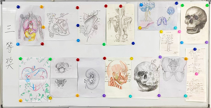 作品征集阶段,参赛学生紧扣竞赛主题,充分发挥专业功底与创作灵感,灵活运用铅笔、水彩等多种绘画工具,精准呈现人体各系统结构形态与比例关系。部分作品不仅解剖细节严谨规范,更巧妙融入医学人文设计理念,将专业知识与艺术表达、人文关怀深度结合,展现出扎实的专业基础与良好的综合素养,凸显了“精准认知+人文素养”的竞赛导向。评审环节,由学院领导、解剖专任教师及实验教师组成的评审团,经赛前专项培训后,从解剖结构准确性、形态比例合理性、绘图技法专业性、人文内涵呈现等维度进行综合打分,全程秉持公平、公正、公开原则,最终评选出一、二、三等奖若干名。
