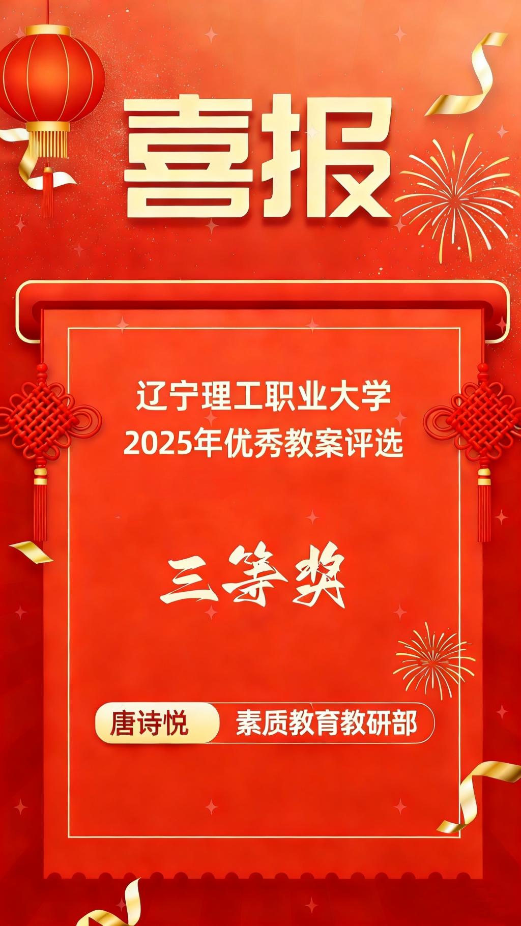我部唐诗悦老师在辽宁理工职业大学2025优秀教案评选中荣获三等奖