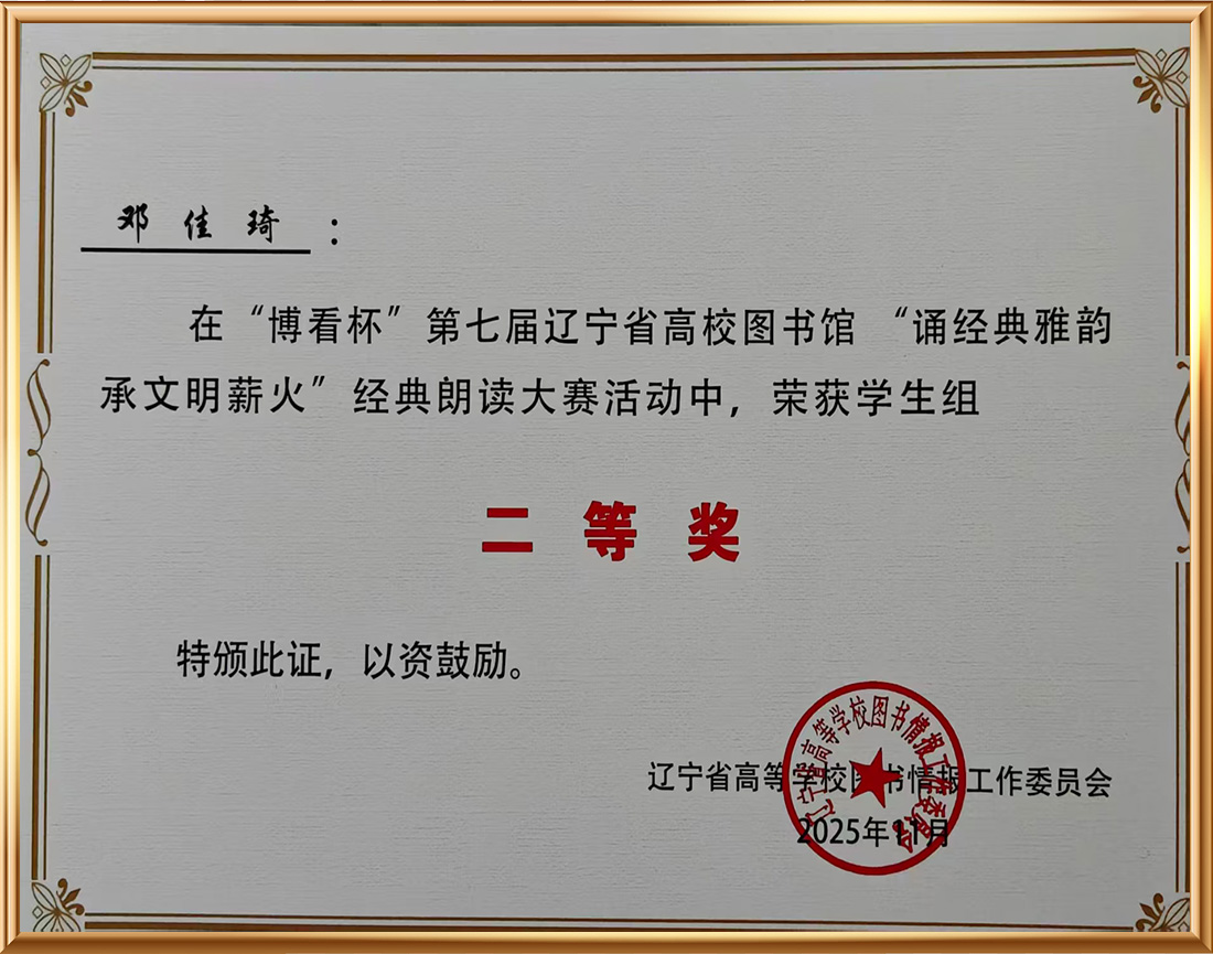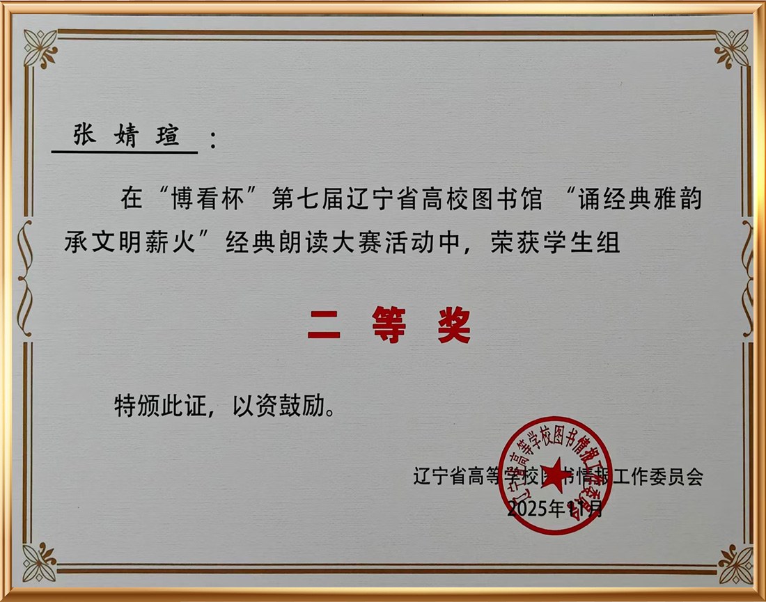 “博看杯”第七届辽宁省高校图书馆“诵经典雅韵 承文明薪火”经典朗读活动中荣获二等奖 |