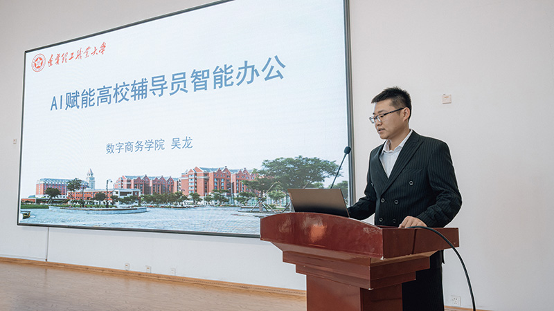 会上,数字商务学院辅导员吴龙老师围绕《AI赋能高校辅导员智能办公》展开深度分享,分别从智能体、智能体直接应用、智能体间接应用、图像应用等四个关键维度,为全体辅导员呈现了AI技术在高校学生工作办公场景中的实践方向与应用价值。