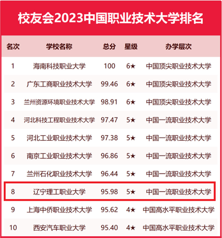 在最新2023校友会中国职业技术大学分类排名中,我校跃居第八名,被评为五星级、中国一流职业技术大学!