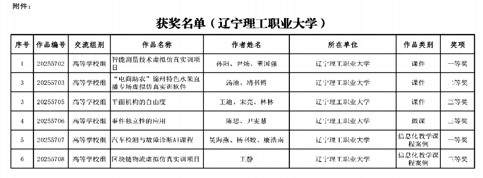 本次评选中,学校选送的作品涵盖课件、微课、信息化教学课程案例三大类别,聚焦职业教育特色与行业需求,展现了丰富的教学创新思路。孙阳团队的课件作品《智能测量技术虚拟仿真实训项目》,吴海燕团队的信息化教学课程案例作品《汽车检测与故障诊断AI课程》,荣获一等奖;汤池团队的课件作品《“电商助农”锦州特色水果直播专场虚拟仿真实训软件》,荣获二等奖;王迪团队的课件作品《平面机构的自由度》,陈思团队的微课作品《事件独立性的应用》,王静团队的信息化教学课程案例作品《区块链物流虚拟仿真实训项目》,荣获三等奖。