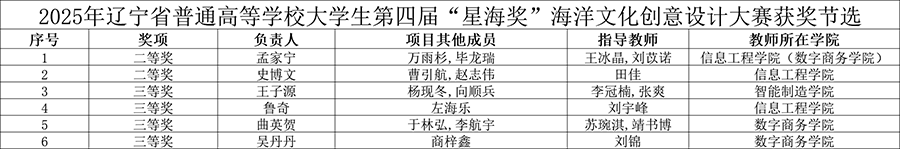 近日,由辽宁省教育厅主办的2025年辽宁省普通高等学校大学生第四届“星海奖”海洋文化创意设计大赛省级评选结果正式揭晓。我校学生凭借扎实的专业功底与前沿的创新理念,最终斩获二等奖2项、三等奖4项,充分彰显了我校在文化创意领域的育人成效与跨学科创新实力。