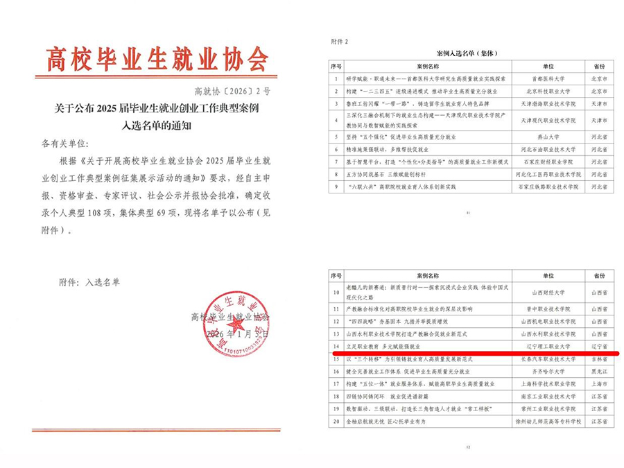 经高校毕业生就业协会历经五个月资格审查、专家评议、社会公示及协会审议批准,最终确定收录个人典型案例108项、集体典型案例69项,我校两项案例凭借鲜明的职业教育特色、扎实的工作成效及突出的示范价值,成功位列其中,成为全国高校毕业生就业创业工作的优秀范例。