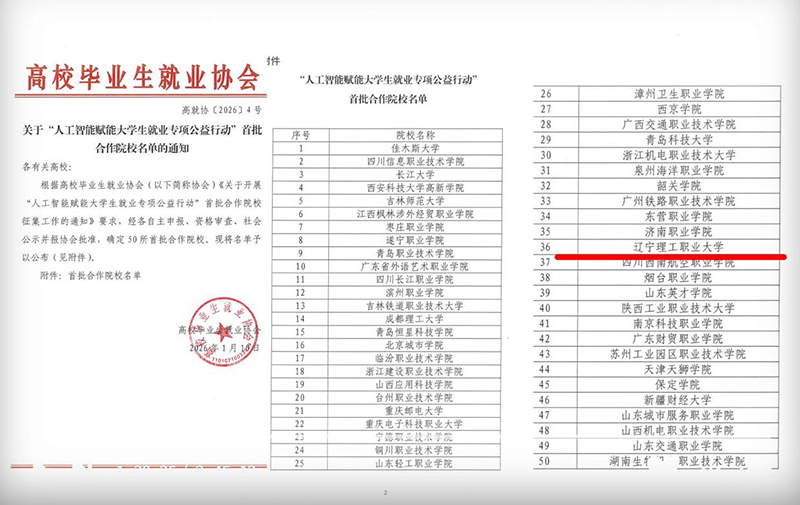 新岁序开,捷讯迭传。1月9日,高校毕业生就业协会公布首批合作院校名单,辽宁理工职业大学凭借在专项行动中的突出表现成功入选,全国仅50所高校上榜。其中,职业院校36所,普通高校14所。这是我校历经十个月的踏踏实实、潜心付出、不懈努力,高标准推进赢得的最珍贵的回馈!