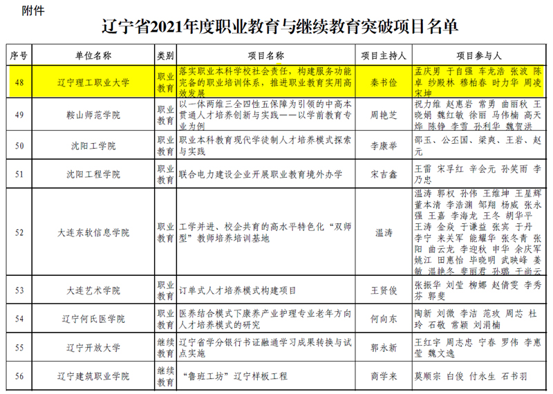 日前,辽宁省教育厅公布了辽宁省2021年度职业教育与继续教育突破项目名单,我校《落实职业本科学校社会责任构建服务功能完备的职业教育培训体系推进职业教育实用高效发展》榜上有名。